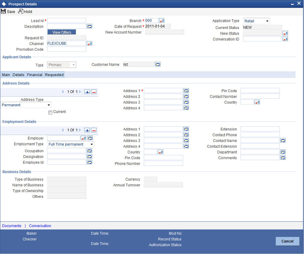 You can capture the address and employment related details of the prospective customer in ‘Details’ tab.