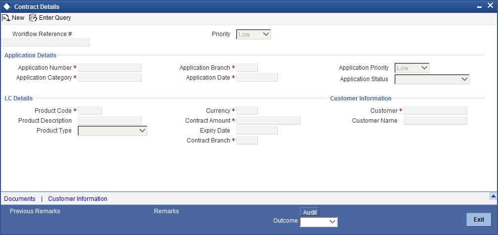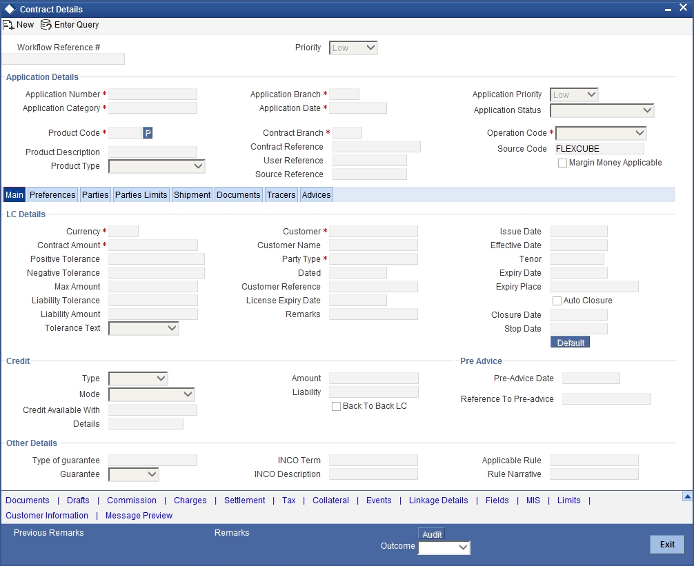 Refer the chapter titled ‘Processing a LC Contract’ in the Letter of Credit User Manual for further details about the fields, tabs and buttons in the screen.