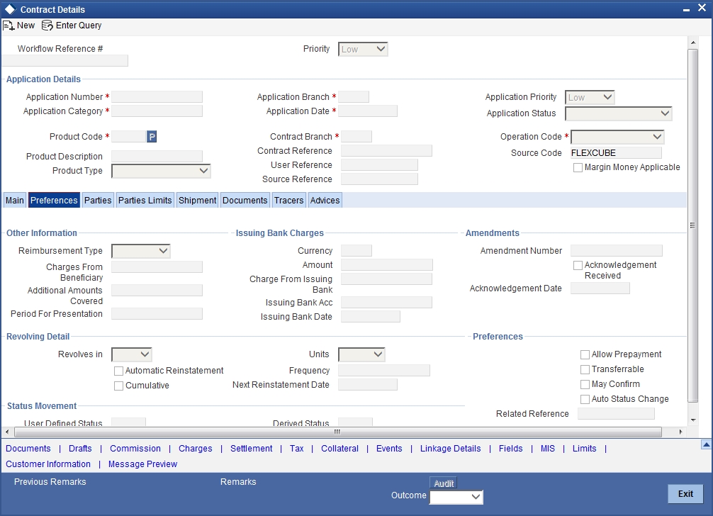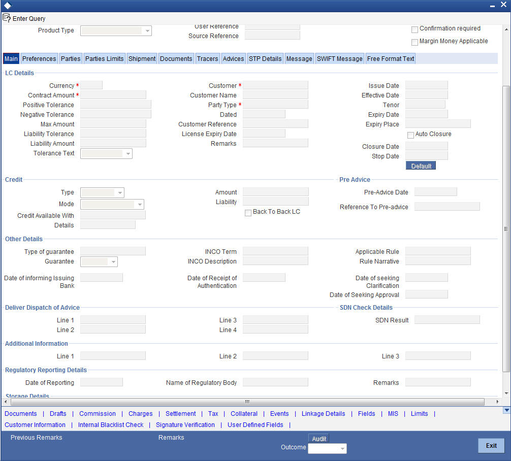 Refer to the chapter titled ‘Processing a LC Contract’ in the Letter of Credit User Manual for further details about the fields, tabs and buttons in the screen.