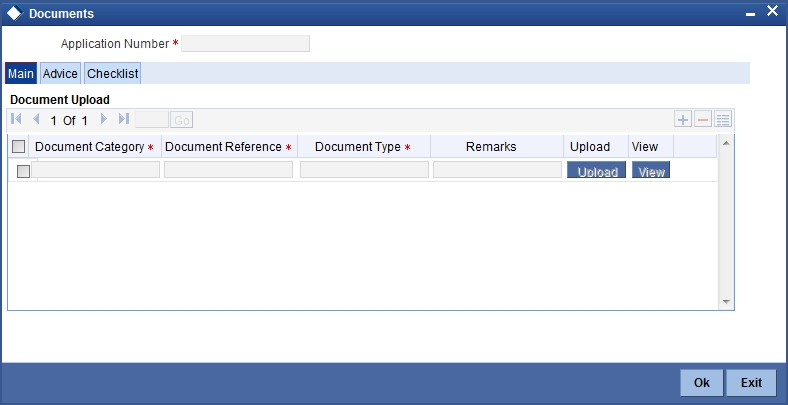 You can capture the customer related documents in central content management repository through the ‘Documents’ screen. Click ‘Documents’ button to invoke this screen.