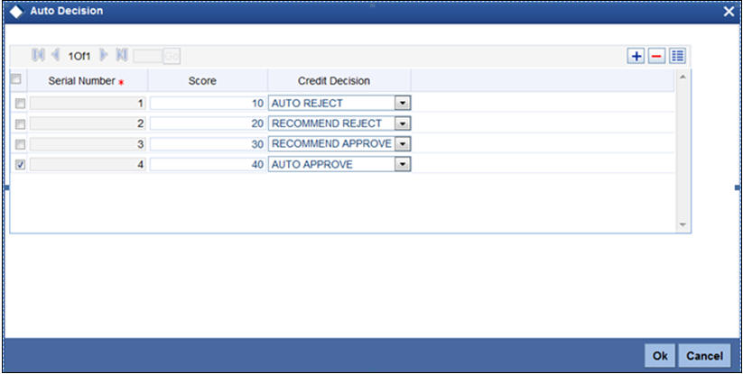 If you have checked the option ‘Auto Decision Required’ during Application Entry stage, the based on the applicant credit score – auto decision mapping maintained in ‘Auto Decision’ screen, the system decides whether to approve the finance or not. The system makes one of the following decisions in that case: