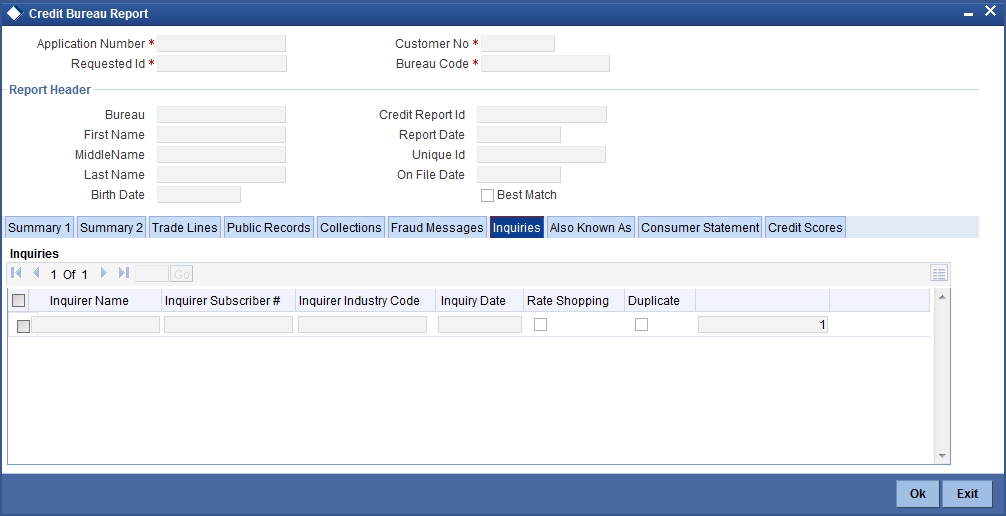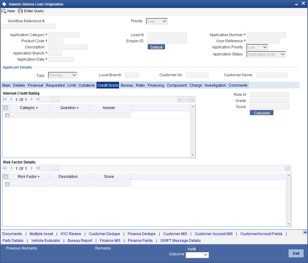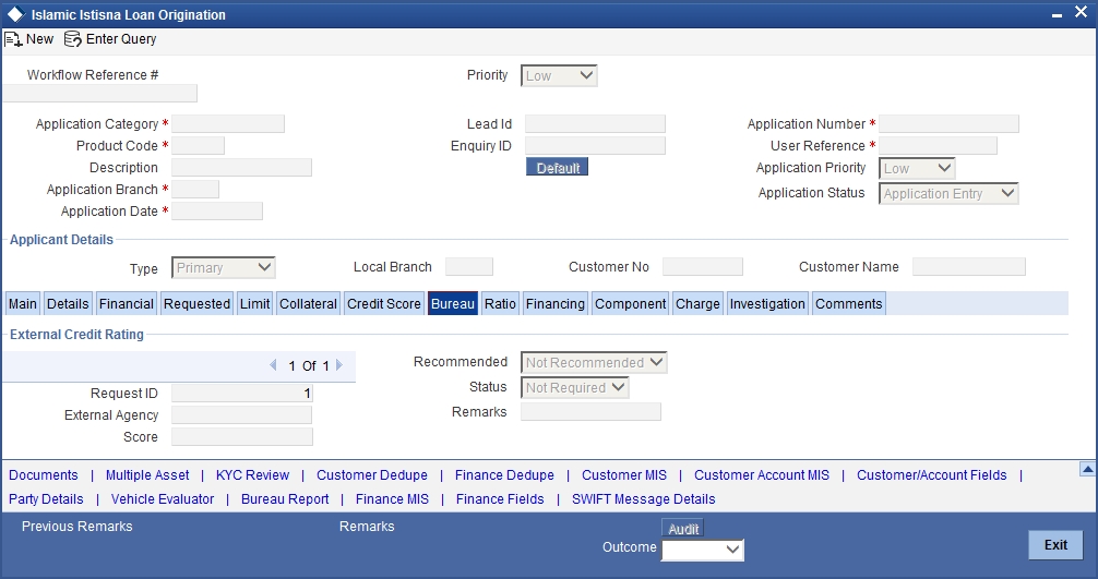 The system will invoke the external valuation agency for credit evaluation. You can view the details in the bureau tab. This includes the score assigned by the agency for the customer.