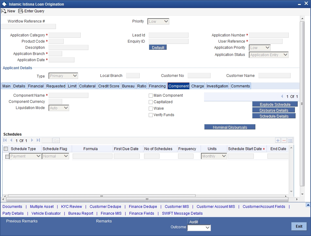 In ‘Component’ tab, the system calculates and displays the payment schedules and the schedule details based on the finance offer selected. If you have selected an ‘Enquiry ID’ for the customer, then the schedule details that have been stored for the corresponding finance proposal are displayed here. You can modify them, if required.