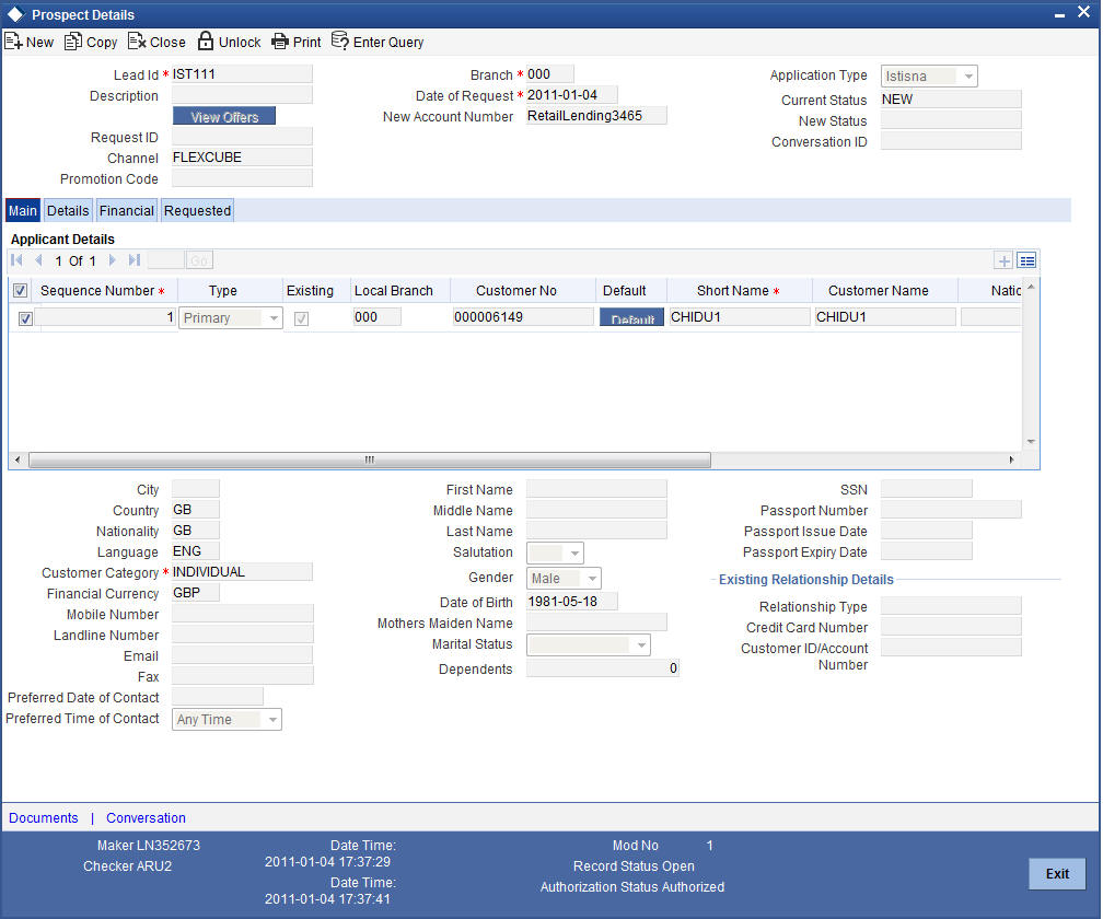 You can maintain the details related to the prospective customer in ‘Prospect Details’ screen. You can invoke this screen by typing ‘ORDLEADM’ in the field at the top right corner of the Application tool bar and clicking the adjoining arrow button.