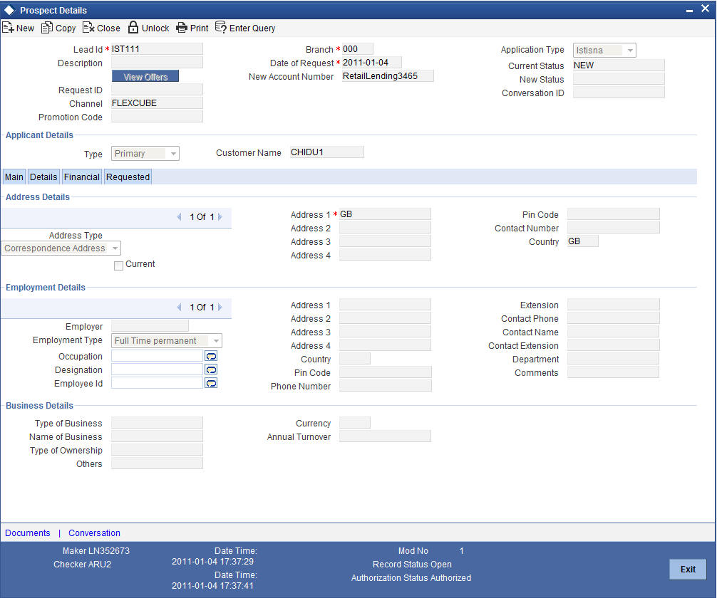 You can capture the address and employment related details of the prospective customer in ‘Details’ tab.