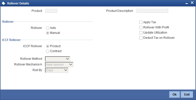 You can specify the rollover details for the product you are defining, by invoking the Product Rollover details screen using the ’Rollover Details’ button in the Product Preferences screen.