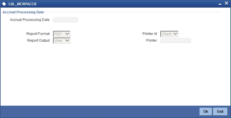 This report provides a summary of the accrual control as of a selected accrual processing date. To invoke the ‘Accrual Control Report’ screen, type ‘MCRPACCR’ in the field at the top right corner of the Application tool bar and click the adjoining arrow button.