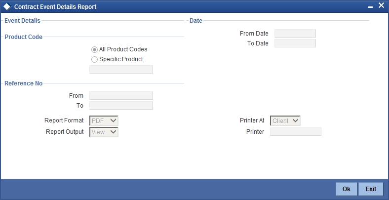 This report provides the event details contracts associated with a specific product or all products. To invoke the ‘Contract Event Details Report’ screen, type ‘MCRPEVNT’ in the field at the top right corner of the Application tool bar and click the adjoining arrow button.