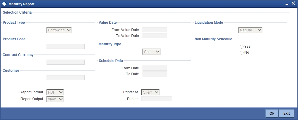This report provides the maturity details of Islamic money market contracts. To invoke the ‘Maturity Report’ screen, type ‘MCRPMATR’ in the field at the top right corner of the Application tool bar and click the adjoining arrow button.