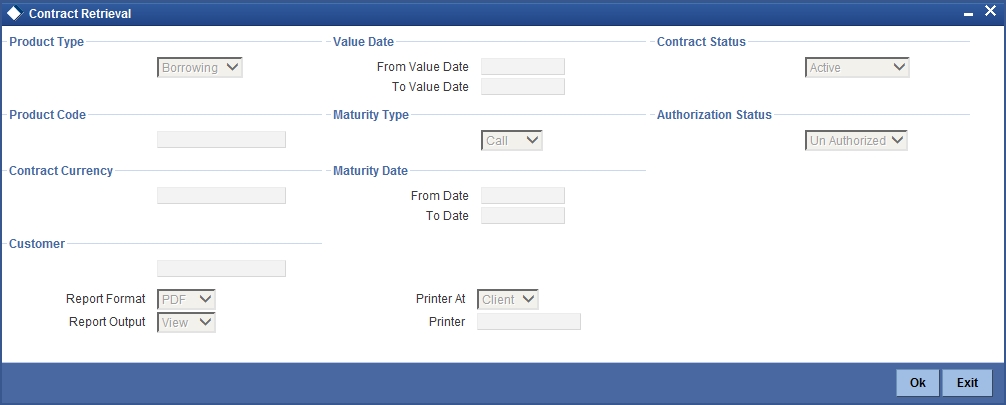 This report provides the retrieval details of Islamic money market contracts. To invoke the ‘Maturity Report’ screen, type ‘MCRPRETR’ in the field at the top right corner of the Application tool bar and click the adjoining arrow button.