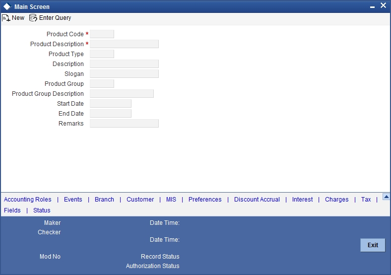 While defining a new product, you should enter a code, which is unique across the different modules of Oracle FLEXCUBE. For instance, if you have used MM01 for the Money Market module, you cannot use it as a code in any other module.