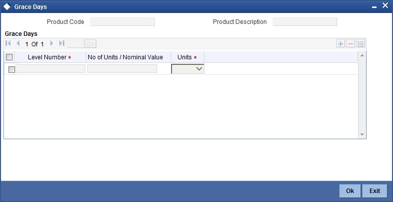 Click ‘Grace Days’ in the Product Preferences screen to access the Grace Days Definition screen. The level numbers get defaulted depending on the number of levels defined in the ICCF Details screen, irrespective of the Basis Amount Type i.e. if you define three levels of penalty for the Basis Amount type Principal and four levels of penalty for the Basis Amount type Interest, levels 1 to 4 will be available to you in the Grace days definition screen. You will not be able to add levels in this screen. Since the level numbers get defaulted from the ICCF Details screen, it is imperative that the expected and overdue components are defined at the ICCF Details screen, prior to the definition of grace days for the levels.