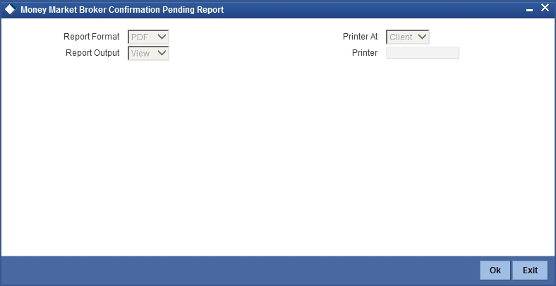 Broker confirmation pending report provides details of deals that are pending for broker confirmation. To generate the report, type ‘MMRPBRCF’ in the field at the top right corner of the Application tool bar and click the adjoining arrow button.