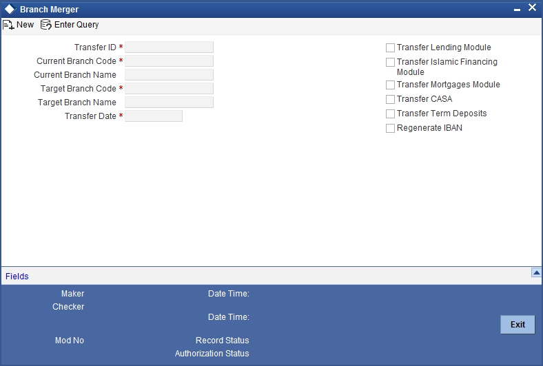 You can transfer Mortgage Mortgages or commitments by merging the branch in the Branch Merger screen. You can transfer Mortgage mortgages or commitments for all the records with transfer date greater the current date from the source branch to a target branch. You can invoke this screen by typing ‘STDBRNTR’ in the field at the top right corner of the Application tool bar and clicking on the adjoining arrow button.