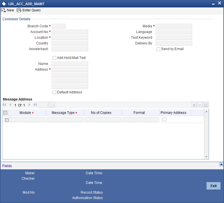 You can specify the format in which a message should be sent to a customer’s address. The default format for a message type needs to be defined through the ‘Advice Format Maintenance’ screen.