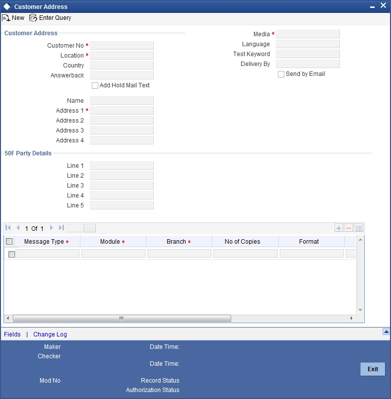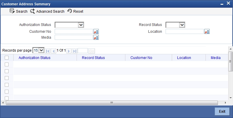 After you have made the mandatory entries, save the record. A customer address record that you have created should be authorized by a user, bearing a different Login Id, before the End of Day (EOD) process can begin. Click ‘Exit’ or ‘Cancel’ to return to the Application Browser.