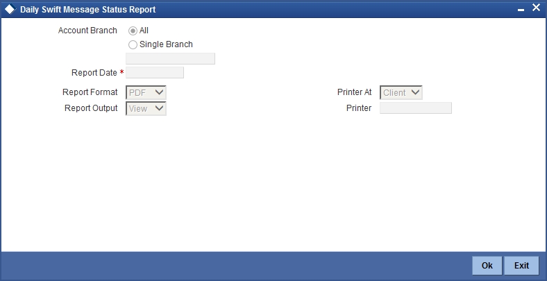 You can invoke ‘Daily Swift Message Status Report’ screen by typing ‘MSRDSWFT’ in the field at the top right corner of the Application tool bar and click the adjoining arrow button. The system will display ‘Print Options’ screen. Set your preferences as to printing the report and click ‘OK’ button.