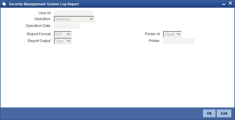 To invoke the screen ‘Security Management System Log Report’, type ‘MSRMSRPT’ in the field at the top right corner of the Application tool bar and clicking on the adjoining arrow button. The screen ‘Security Management System Log Report’ is displayed below: