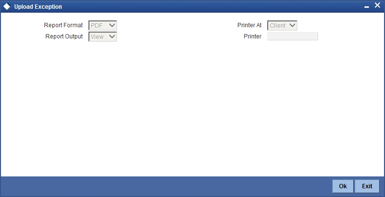To invoke the ‘Upload Exception’ screen, type ‘MSRPLEXP’ in the field at the top right corner of the Application tool bar and clicking on the adjoining arrow button. The screen is displayed below:
