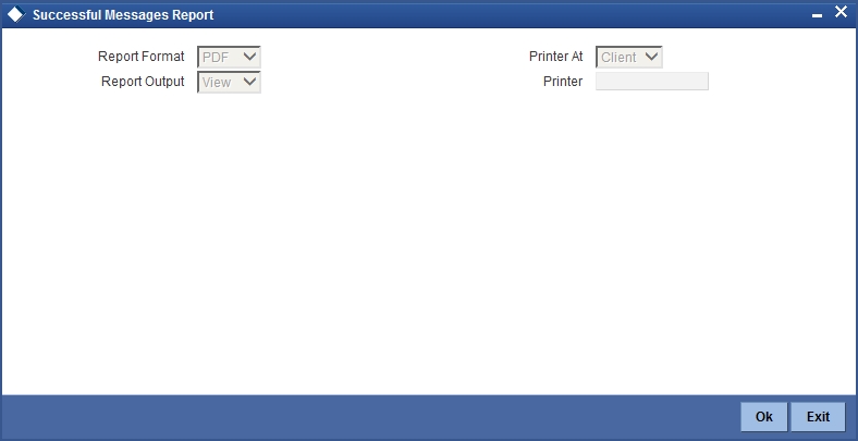 You can generate Successful Messages report using ‘Successful Messages Report’ screen. To invoke the screen, type ‘MSRPLSUX’ in the field at the top right corner of the Application tool bar and clicking on the adjoining arrow button. The screen is displayed below: