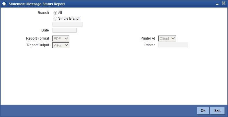You can invoke ‘Statement Message Status Report’ screen by typing ‘MSRSTMSG’ in the field at the top right corner of the Application tool bar and click the adjoining arrow button. The system will display ‘Print Options’ screen. Set your preferences as to printing the report and click ‘OK’ button.