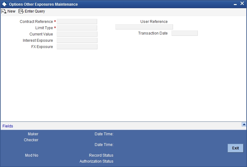 On Inception of the contract, you can specify the Line, the Master Agreement Code, the marked-to-market value of the option, exposure to be tracked due to interest rate fluctuation and exchange rate movements. After the booking of the contract you can specify the various exposures through the ‘Options Other Exposure Maintenance’ screen.