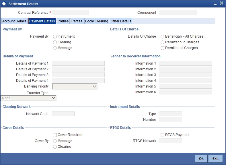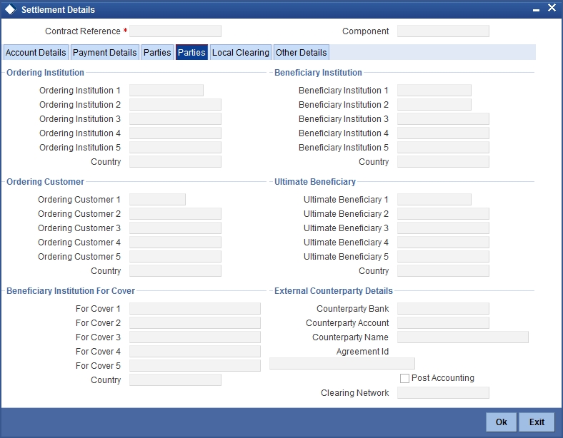 If the other party is customer of the bank, the list maintains the customer account number to select. If other party is a non-customer, the list contains the Nostro and Vostro accounts intermediary GL accounts maintained at the branch parameter.