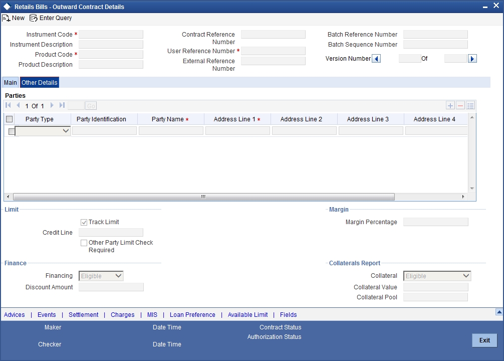 You can reverse the invalid contracts using 'Contract Input - Outward Retail Bills/Cheques for Collection' Screen by using the ‘Reverse’ action button. You can invoke this screen by typing ‘RBDOCONL’ in the field at the top right corner of the Application tool bar and clicking on the adjoining arrow button.