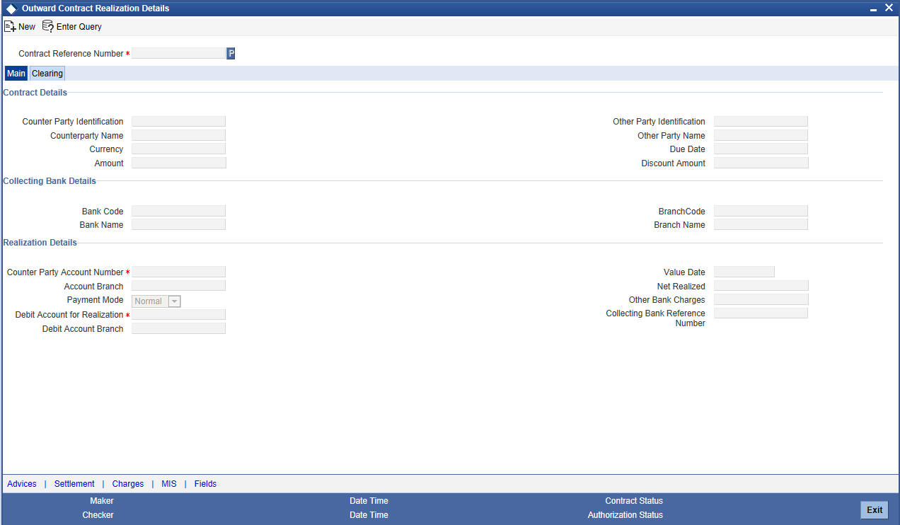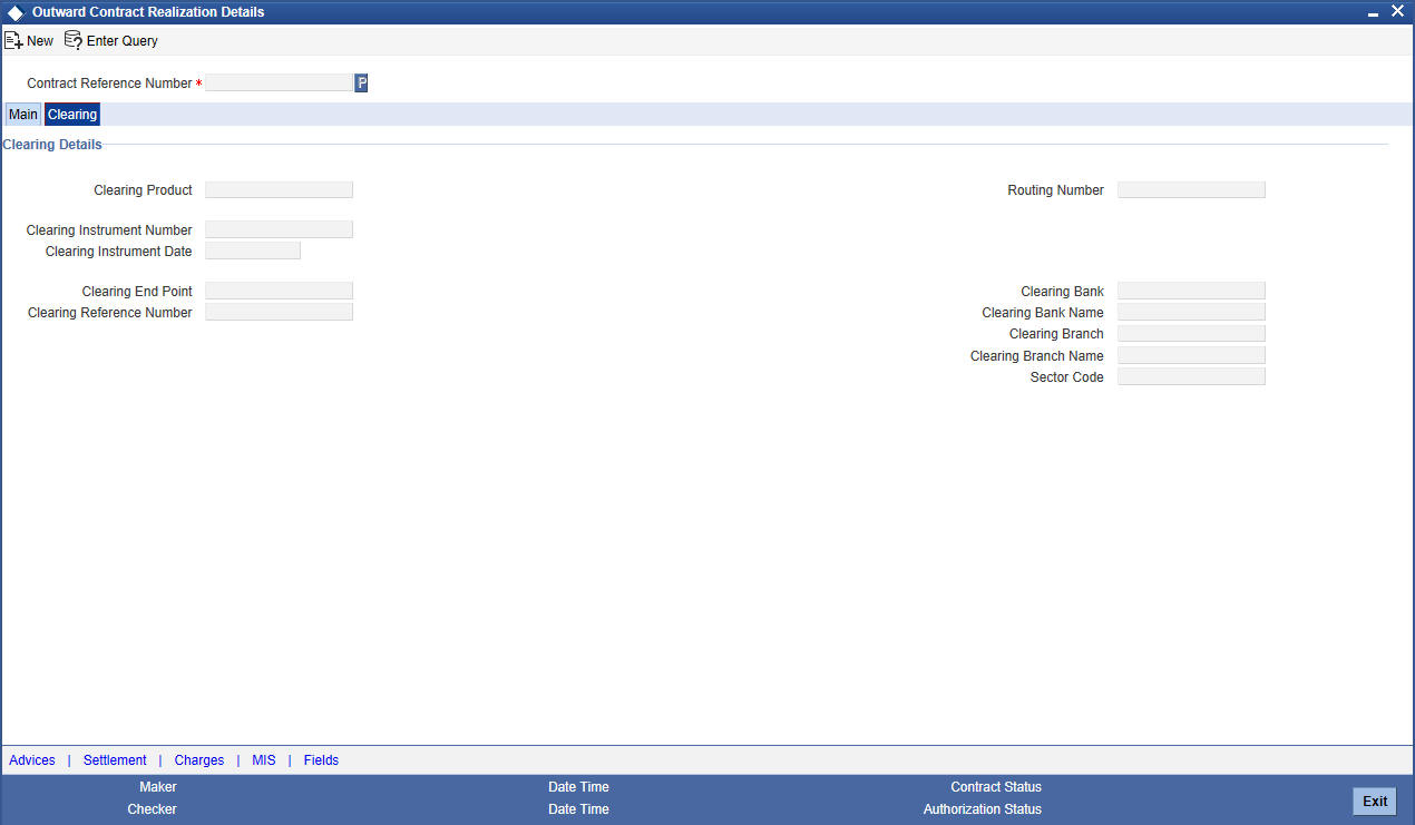 If the ‘Payment Mode’ selected is ‘Clearing’ then the Debit account for realization LOV will have only the clearing GL maintained in the ‘Clearing GL for Outward Collection in RB Branch parameters’. If no value is selected, then, on clicking ‘Default’ button, this clearing GL will be defaulted, which can be edited.