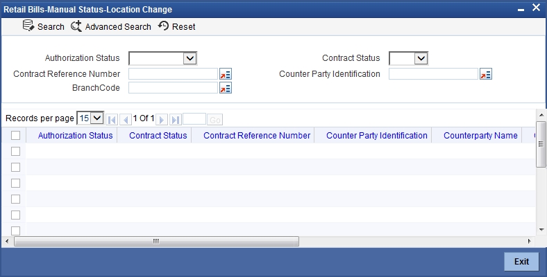 The ‘Retail Bills-Manual Status-Location Change’ screen is used to change the status of the instrument and/or location of the instrument manually.