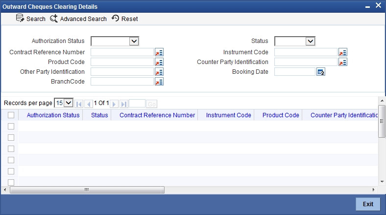 If the activation date of an instrument that is associated with the product type ‘Outward Cheque for Clearing’ is less than or equal to the current system date, then you can generate the clearing contract. It is mandatory that the instrument has not been realised, closed or returned.