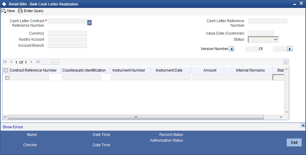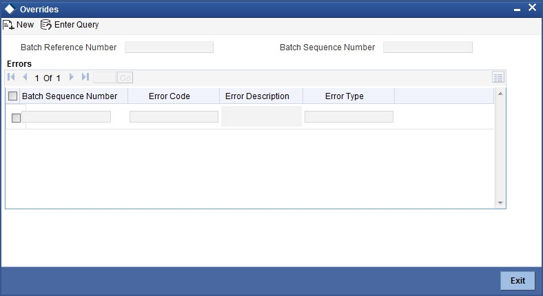 You can view the errors and overrides that took place in the bulk cash letter booking process using ‘Overrides’ screen. Click ‘Show Errors’ button to invoke this screen.