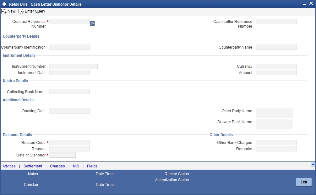 In case of non-payment of an instrument, you can capture the details specific to the dishonour using ‘Retail Bills - Cash Letter Dishonour Details’ screen. To invoke this screen, type ‘RBDCLDIS’ in the field at the top right corner of the application toolbar and click the adjoining arrow button.