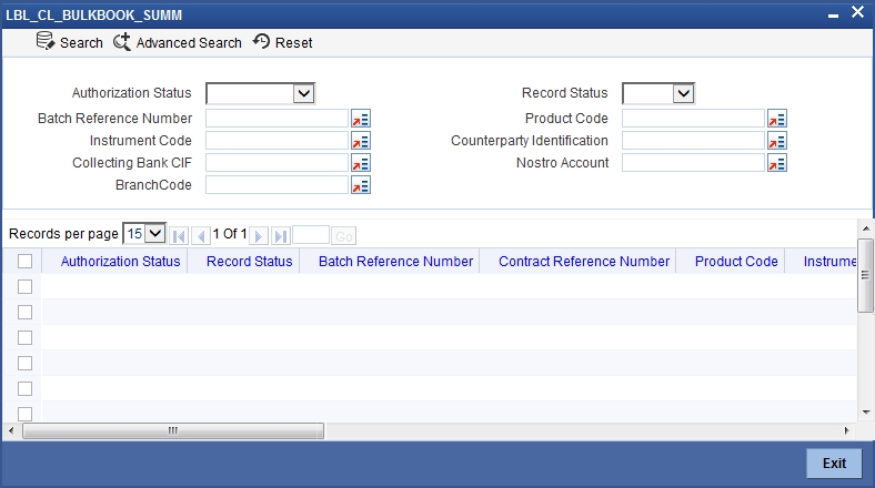You can view a summary of bulk booking of cash letters using ‘Retail Bills - Cash Letter Bulk Booking Summary’ screen. To invoke this screen, type ‘RBSBFCUC’ in the field at the top right corner of the application toolbar and click the adjoining arrow button.