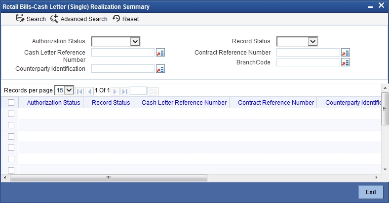 You can realize all instruments sent under a cash letter using ‘Retail Bills - Bulk Cash Letter Realization’ screen. To invoke this screen, type ‘RBDBFCRE’ in the field at the top right corner of the application toolbar and click the adjoining arrow button.