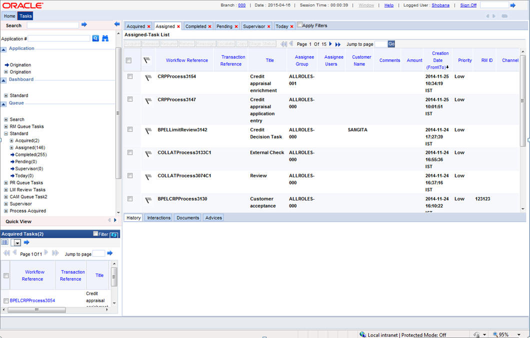 Click ‘Ok’ to proceed to the next stage. To select the acquired task for the next stage, select ‘Acquired’ under ‘Standard’ option in the ‘Task’ menu. All the tasks that have been successfully acquired are displayed in the right side of the screen. Search for your workflow reference number and click the ‘Workflow Ref No’ to open the required screen.