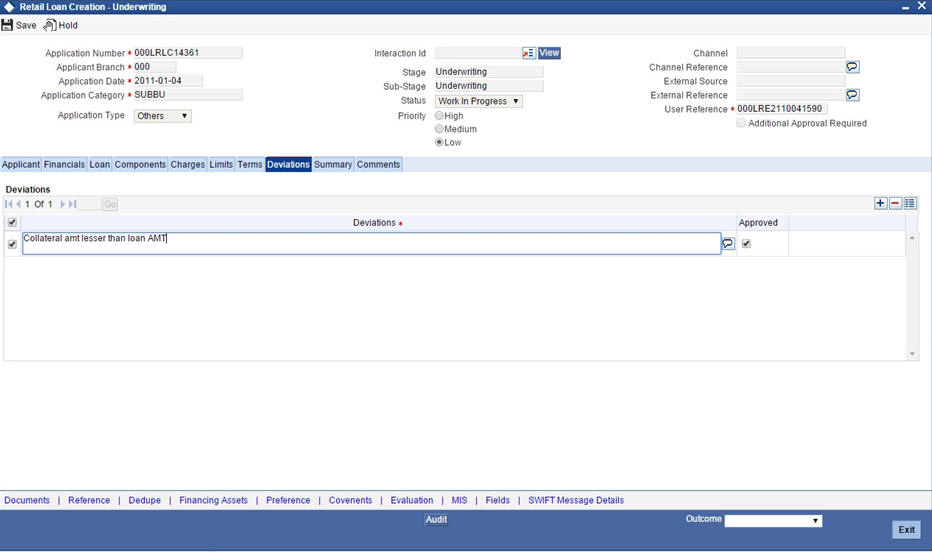 7 | Credit Evaluation | ORDRLCCE | PROCEED | Underwriting | Task will be moved to ‘Underwriting’ stage only when the user selects the outcome ‘PROCEED’ and saves all 3 stages (Credit evaluation, Risk evaluation and Legal opinion) are completed | |||||||||||||||||