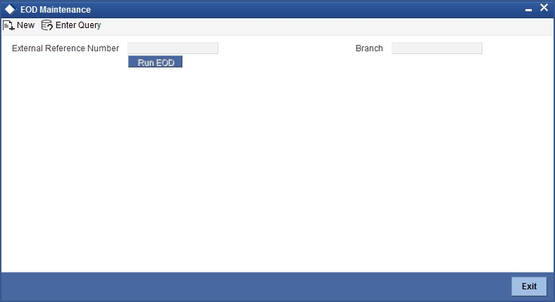 You can run the branch EOD using the EOD Maintenance screen. You can invoke this screen by typing ‘EODM’ in the field at the top right corner of the Application tool bar and clicking the adjoining arrow button.
