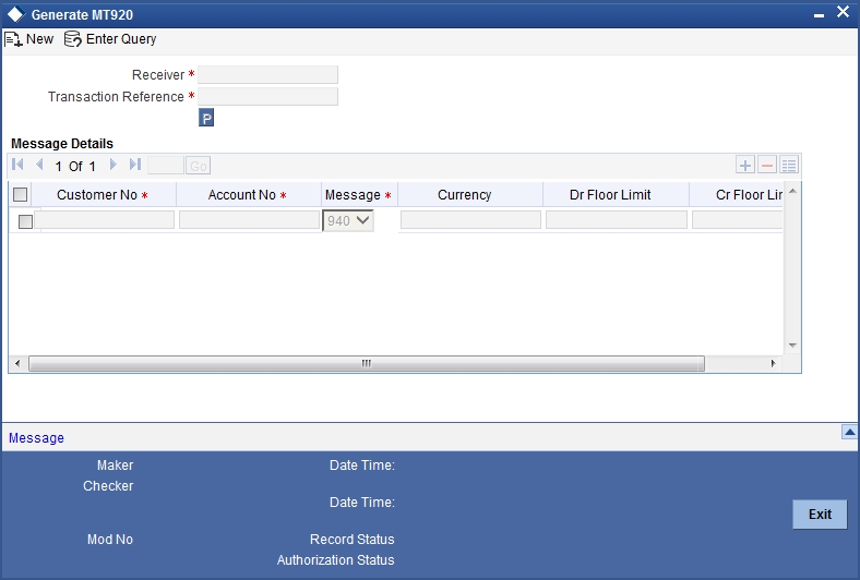 Oracle FLEXCUBE allows you to generate SWIFT Messages for transactions. MT920 is a transaction message requesting latest information available for the particular account. The request will be to transmit account customer statement message (MT940) or Balance report (MT941) or Interim statement (MT942) or a customer summary statement (MT950).