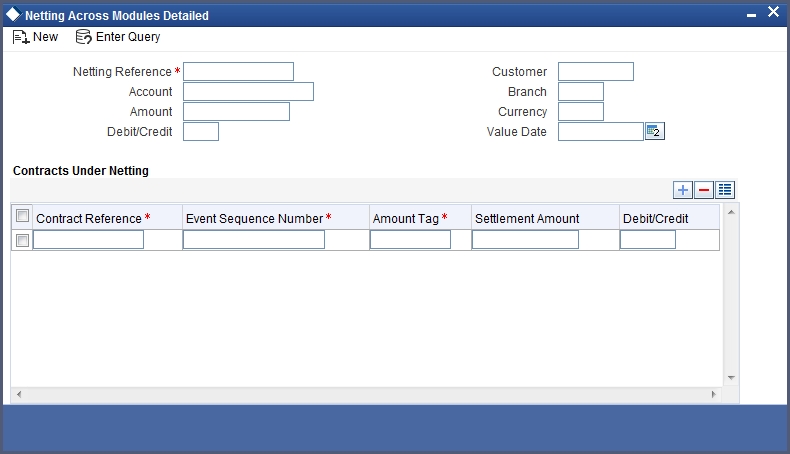 Oracle FLEXCUBE allows you to ‘net’ contracts pertaining to different modules provided they satisfy certain conditions. The Netting facility is useful at the time of contract settlement. You can opt to net two or more contracts at the time of settlement if the contracts are: