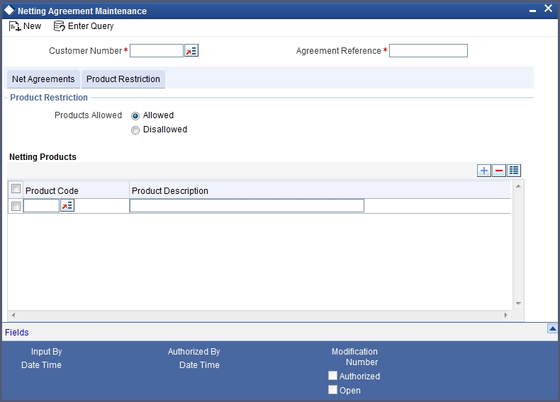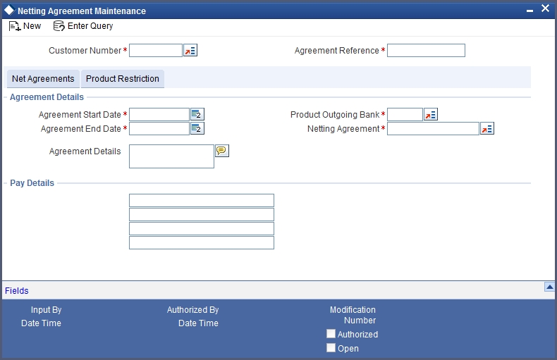 Each netting agreement record that you maintain should be identified with a unique reference number in Oracle FLEXCUBE. You can specify a unique number to identify each agreement.