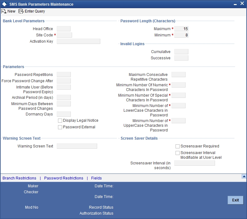 Certain parameters related to security management should be defined at the bank level. These parameters will apply to all the users of the system. Examples of such parameters are the number of invalid login attempts after which a user-id should be disabled, the maximum and minimum length for a password, the number of previous passwords that should not be used, the interval at which the password should be changed by every user, etc.