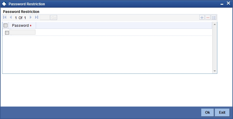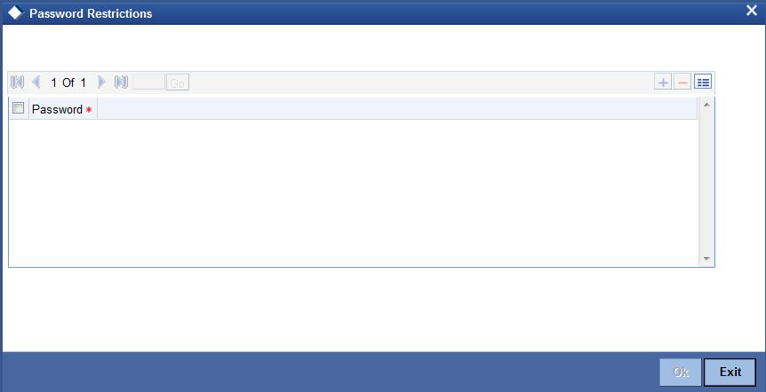 Click ‘Password Restrictions’ button to define restricted passwords at the bank level that should not be used by any user of the bank.
