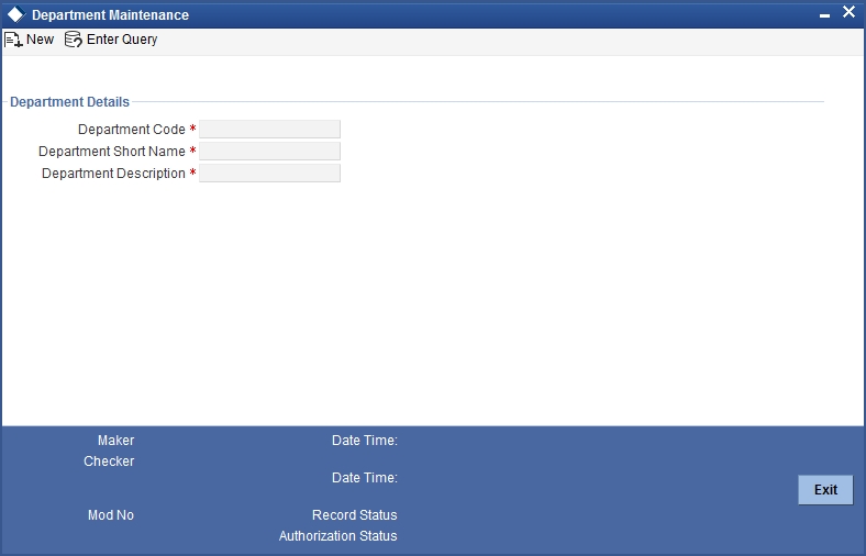 Oracle FLEXCUBE allows you to maintain department details in the system. However, only privileged administrative users can edit the department details. You can capture department details in the ‘Department Maintenance’ screen. You can invoke this screen by typing ‘SMDDPTMT’ in the field at the top right corner of the Application tool bar and clicking on the adjoining arrow button.