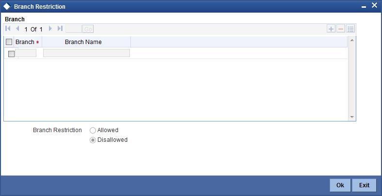 After choosing either the ‘Allowed’ or ‘Disallowed’ option, click add icon to add a record under the ‘Branch Restrictions’ list. Into each added record’s field, select the required branch by clicking the adjoining option list.
