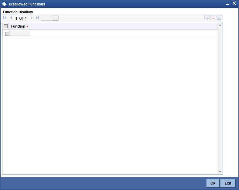 You can restrict certain functions from being performed by a user. You can specify such restrictions in the ‘Disallowed Functions’ screen. Click ‘Disallowed Functions’ button to invoke this screen.