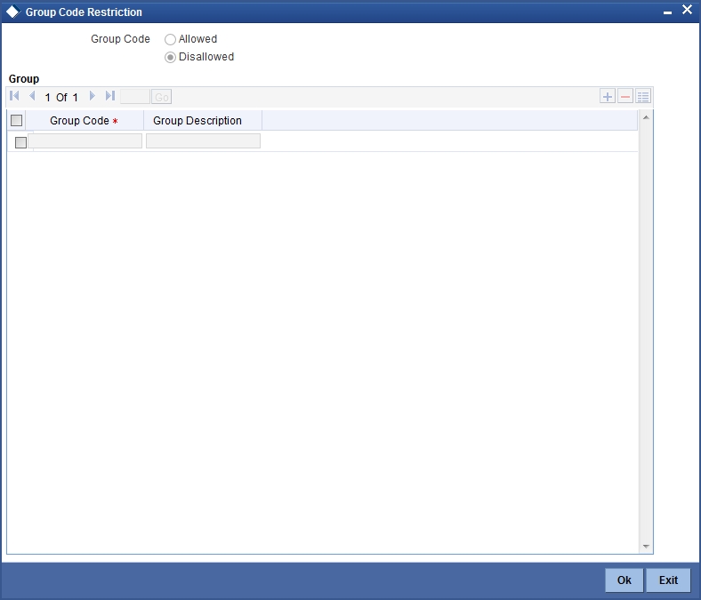 You can restrict the group code for the selected Oracle FLEXCUBE user id using ‘Group Code Restriction’ screen. To invoke this screen, click ‘Group Code Restriction’ button in ‘User Maintenance’ screen.