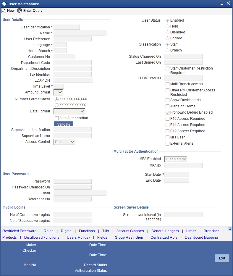 Oracle FLEXCUBE allows you to automatically disable the profile of all the users who have not logged into the system for a pre-defined period of time. A user ID is considered dormant if the difference between the last login date and the current date is equal to or greater than the number of ‘Dormancy Days’ that you specify in this screen. This is reckoned in calendar days i.e. inclusive of holidays.