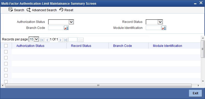 You can view multi-factor authentication limit maintenance in the ‘Multi-Factor Authentication - Limit Maintenance Summary’ screen. You can invoke this screen by typing ‘SMSMFALM’ in the field at the top right corner of the Application toolbar and clicking on the adjoining arrow button.