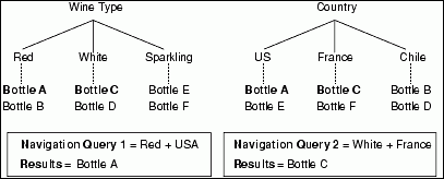 These dimension values are referred to as the navigation descriptors. A navigation query instructs the MDEX Engine to return the set of records that represents the intersection of all the dimension values that it contains. For example, in the illustration below, Bottle A represents the intersection between the Red and USA dimension values. Bottle C represents the intersection between the White and France dimension values.